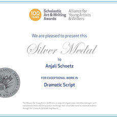 Anjali wrote a foreign film script titled “Money Tree”, which depicts the poverty trap of young disadvantaged Indian youth facing systemic challenges preventing their upward economic mobility. In the script, the light hearted humorous dialogue by the children slowly reveals the system of poverty that they are trapped in. Just like the money tree cannot grow because of its surroundings neither can the children. Anjali won a National Silver Medal scholastic award and regional Gold Key award. Less than 1% of 260,000 works submitted got recognized at the national level with a silver medal.